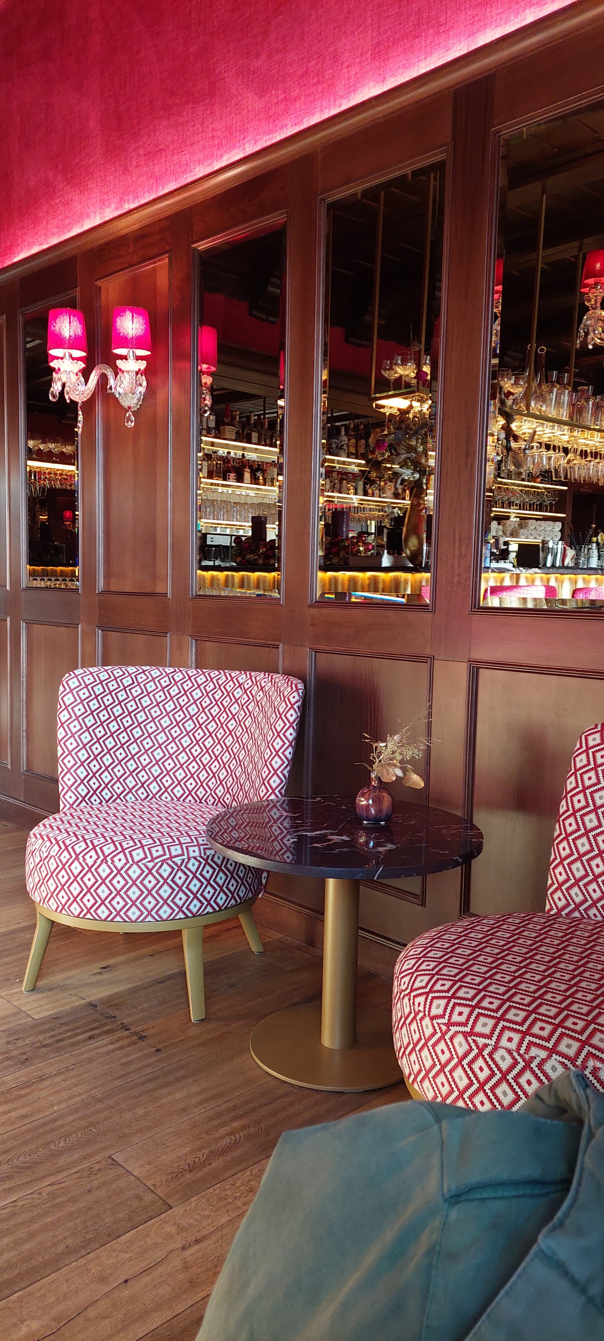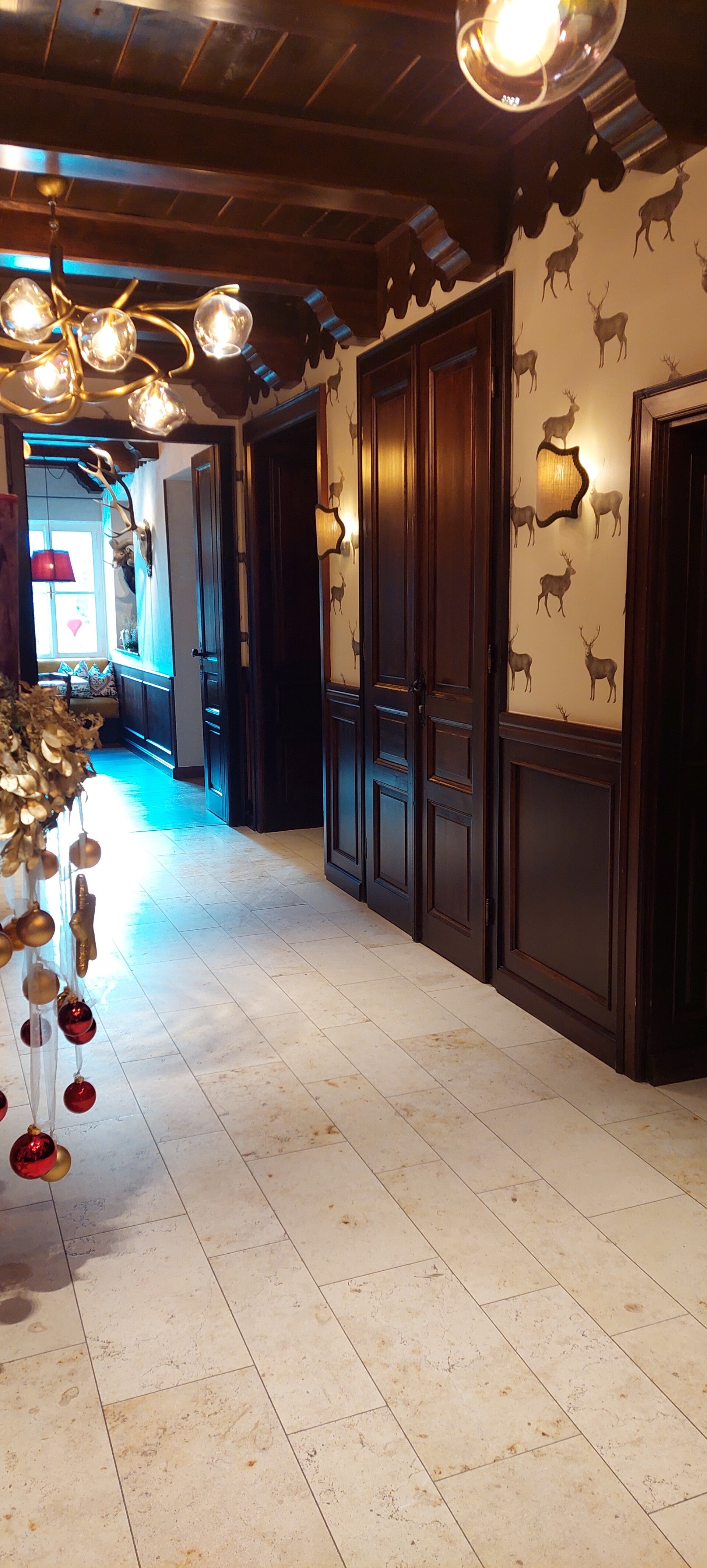 Even ter informatie: mijn vader is al 82, en toch ging hij nog even mee de bergen in, richting de 1000 meter hoogte. We liepen langs smalle wegen met harde sneeuw, bladeren die glad waren en wegschoven zodra je erop stapte. De tocht begon nog op een gewone geasfalteerde weg, maar al snel ging het steil omhoog, bezaaid met bladeren. Links van ons stonden een paar paarden in het gras en werden er nog rijtjes huizen gebouwd. Iets verderop kwamen we onze eerste stop tegen, waar we een heerlijk roze gebakje hebben gegeten. Het was een luxe hotel met prachtige gouden details, behang met dieren en een wc vol konijnenprints — echt een grappige ervaring.