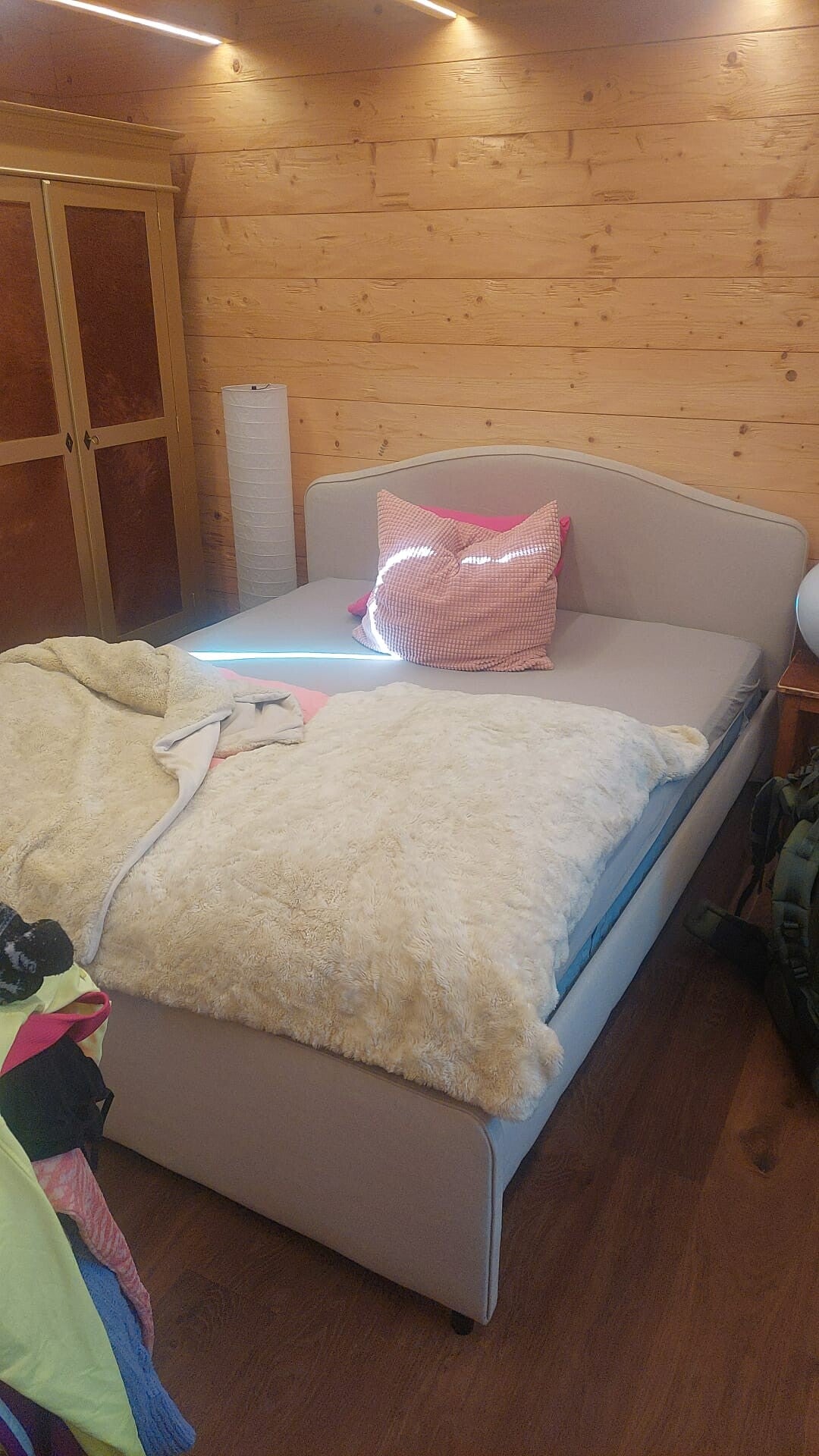 Het is een schattig houten huisje, volledig gebaseerd op pure romantiek. De douche bevindt zich midden in de slaapkamer, met glazen wanden, en het tweepersoonsbed moeten we delen. Als de één gaat douchen, gaat de ander dus maar even een blokje om. Er staat een leuke open haard en er is centrale verwarming en een kleine vaatwasser.