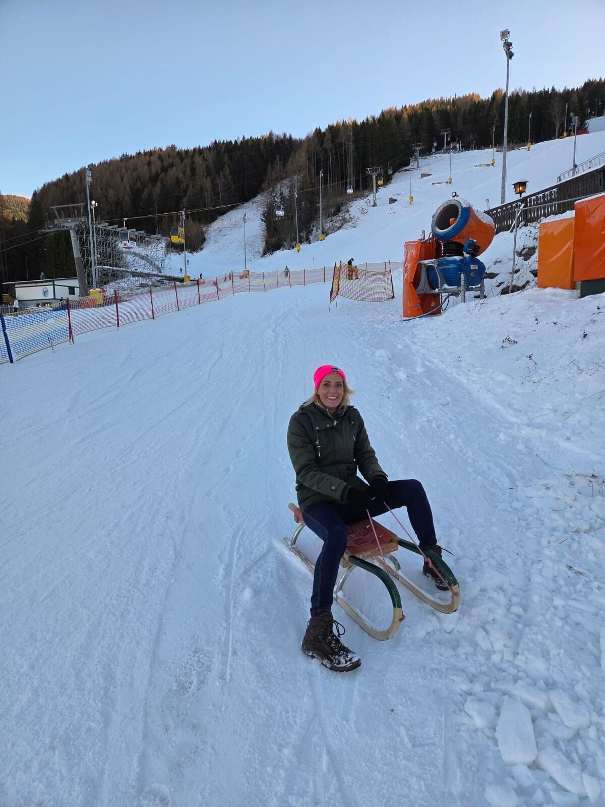 Na een heerlijke Schnitzel mit Pommes ging ik met mijn slee naar de rodelbaan, terwijl mijn vader boven bleef genieten van het uitzicht. Binnen nog geen kwartier was ik alweer beneden: het ging behoorlijk snel, met leuke bochten, en ik moest goed mijn benen en voeten gebruiken om af te remmen.